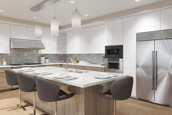 • Kitchen Countertops & Islands: Ceasarstone® solid surface deck with 2" square edge detail. Color an island design per approved design packages. Decorative tile or stone backsplash at cooktop
